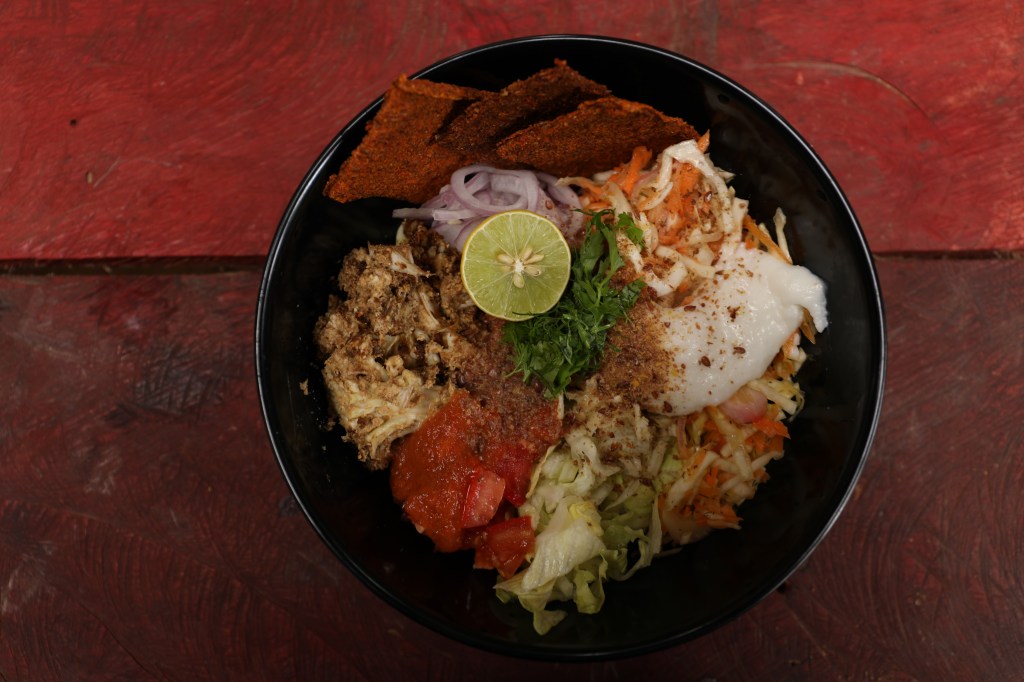 Dinner bowl featuring ‘buffalo wing’ cauliflower, vegan coleslaw, lettuce, tomatoes and lime juice