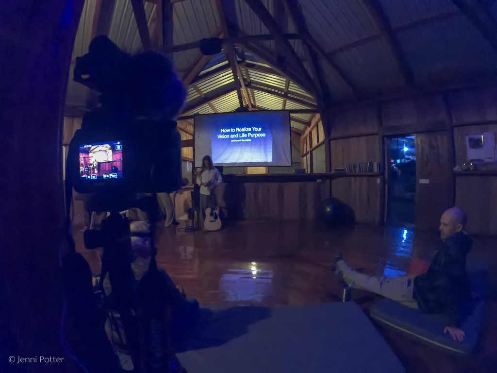 On a side note, the community centre at Terra Frutis is truly a thing of beauty. A circular building with a gorgeously polished floor, a truly spectacular central structure and an adjacent hot tub room. This was the building I spent a large amount of time in. When I wasn’t babysitting my batteries or my camera during events, I was taking part in ecstatic dance or lounging in a hammock. During my second week there, I spent a large part of my time (when I wasn’t trying to problem-solve away my tech stress) in a hammock, listening to the sounds of the rainforest and reading Attila. A rather fabulous way to spend one’s time.