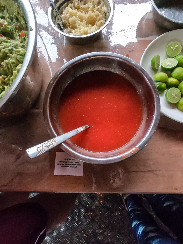 Lunch – I can’t actually remember what I would have for lunch, and didn’t note any of it down. This isn’t surprising as by this point I would be well and truly stuck into whatever the day was throwing at me. I have a feeling it was just a less fancy dinner – there were always plentiful bowls of lettuce, shredded or diced vegetables, usually sauces of some variety (although I stayed away from the very spicy stuff… didn’t need to contend with that as well!) and ground nuts and fresh DIY lime juice to tie all the flavours in together.